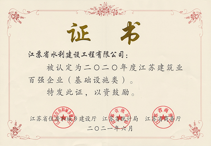 江蘇建筑業(yè)百強(qiáng)企業(yè)2022年度證書